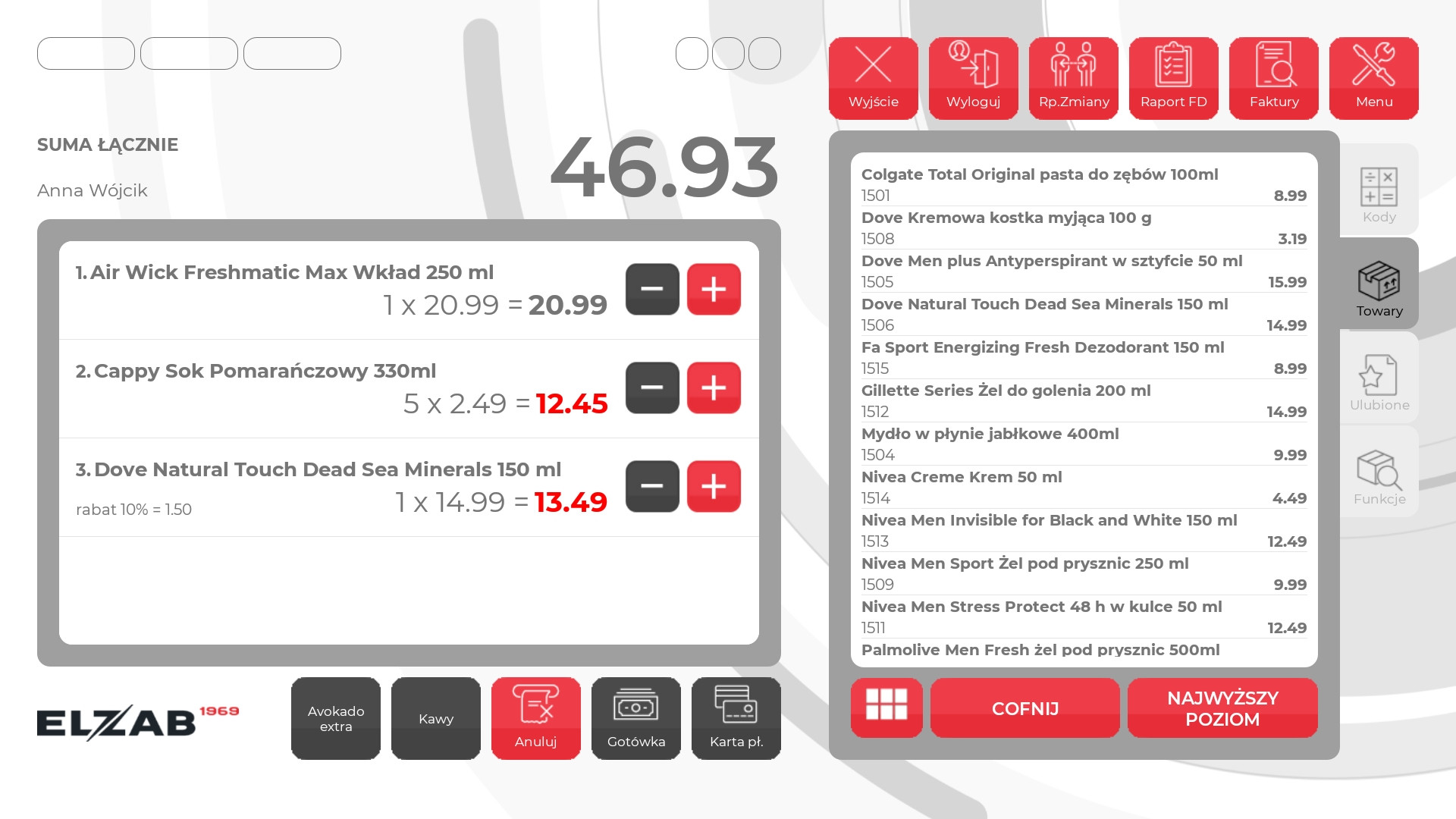 - sprzedaż towarów po kodzie, przez wyszukanie na liście, za pomocą graficznych klawiszy bądź poprzez zeskanowanie czytnikiem kodów kreskowych,