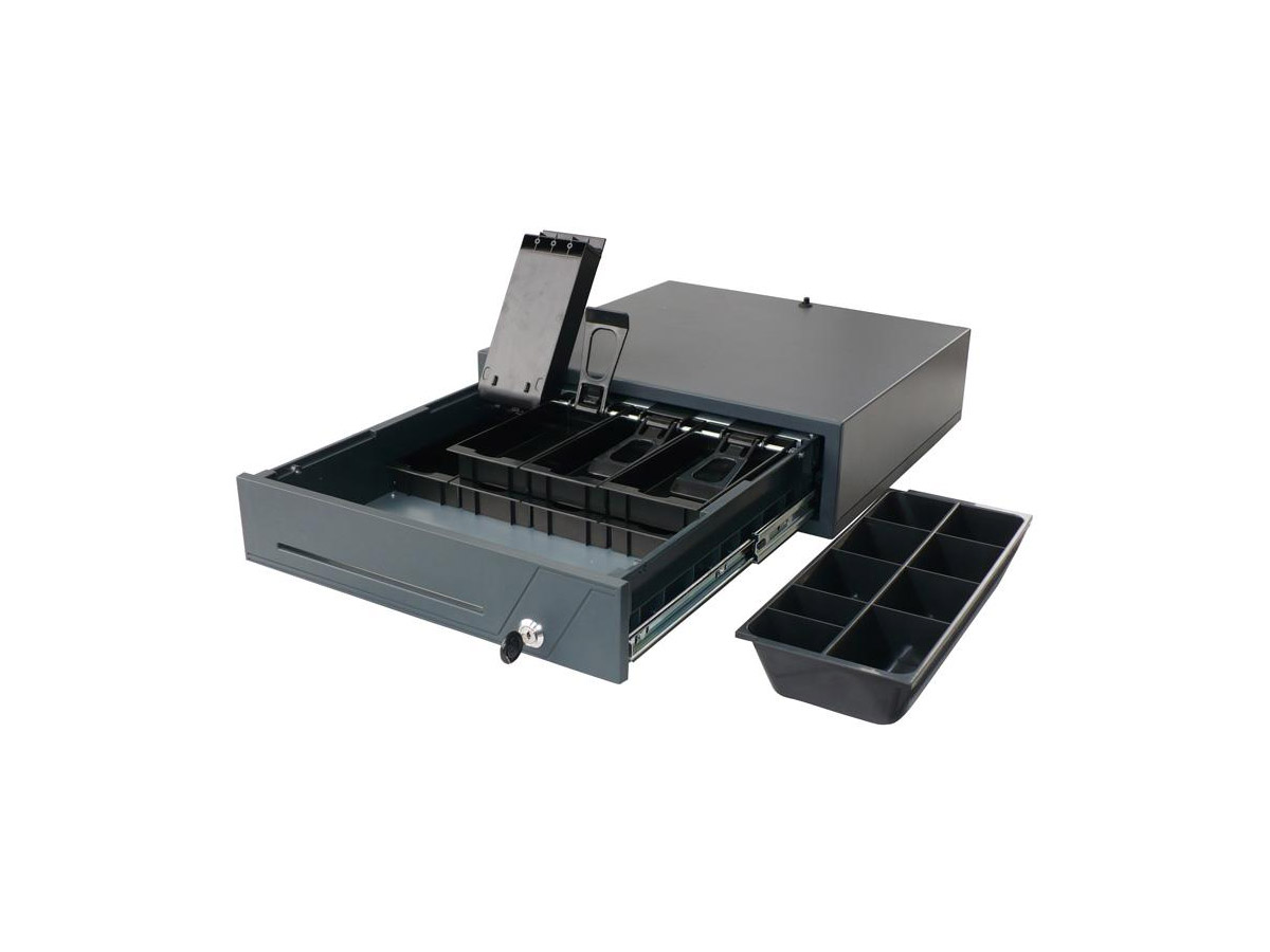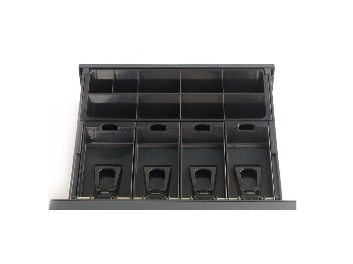 Model SKL wyposażony jest w 8 przegródek na banknoty z metalowymi dociskami oraz 9 przegródek na monety, co ułatwia segregację gotówki i przyspiesza obsługę klientów. Dzięki ergonomicznemu układowi, ta szuflada do punktu sprzedaży pozwala na zachowanie porządku i szybki dostęp do środków płatniczych.